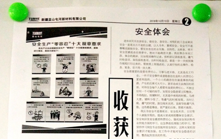 新材料事业部积极在人员集中进入厂区的大门口、二道门口、办公楼大厅通过摆放宣传展板、悬挂横幅标语等多种形式,向职工宣传“零容忍十大规章要求”的主要内容,提升职工安全意识。领导干部亲身以躬带头熟记“零容忍十大规章要求”,各部门、车间、班组也通过开展形式多样的宣传活动。如:以“零容忍”为主题的专题培训,手抄“零容忍”,每位基层员工和领导佩戴标识牌、解读“零容忍”等活动,将“零容忍”的理念、宗旨在工作实践过程中升华、扩散、渗透,为全体职工所认识、认知、认同、接受,转化为全体员工遵章守法、按章作业的自觉行动,使安全文化内化于心,外化于行。