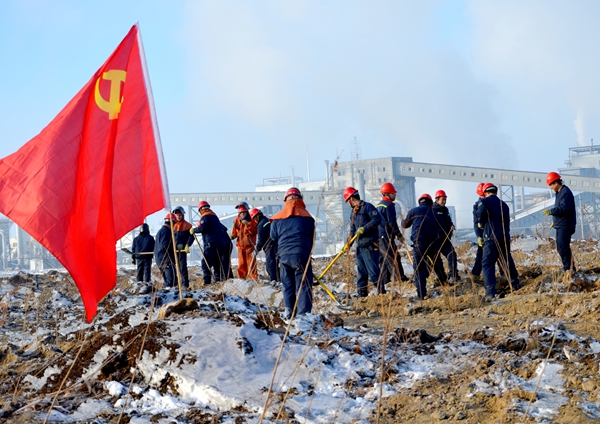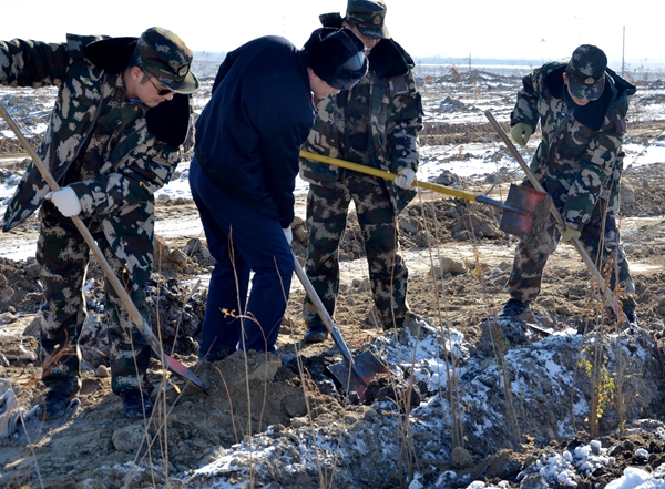 遥望远处,能源公司电石厂渣场空地的每个树埂上迎风飘动着“Bwin必赢网址”的彩旗,身穿着“Bwin必赢网址”工服的能源公司干部职工们秉承“不怕困难,勇于创新,敢于担当,每战必胜”的企业精神,踩着皑皑的白雪,顶着冽冽的寒风,三人一组,五人一群,通力协作,你铲土,我扶树,配合默契,劲往一处使、汗往一处流,干劲十足,一片热火朝天的热闹景象。