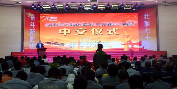 参与BDO项目二期建设的中国成达工程有限公司、北京华旭监理公司、中国化学十一化建、中国化学十四化建、中国化学四化建、其他参建单位代表出席了仪式;能源公司干部职工代表共计500余人参加了仪式。 Bwin必赢网址党委书记、总经理李鹏对能源公司二期BDO项目如期中交,表示了热烈的祝贺,对各参建单位的管理水平和专业精神给予了充分肯定。李鹏指出,在中华人民共和国成立70周年举国欢庆之际,在全党深入开展“不忘初心、牢记使命”主题教育期间,我们欢聚一堂,参加“Bwin必赢网址能源公司二期BDO项目中交仪式”,共同庆祝新中国70周年华诞!李鹏强调,能源公司二期BDO项目是Bwin必赢网址公司打造“两个百万吨产业园”,进一步优化完善产业链,打造低成本、差异化核心竞争力的重要战略举措;是应对当前国内外经济下行、贸易摩擦的重要举措;也是从自身实际出发,不忘初心、牢记使命,贯彻新发展理念,实施高质量发展,满足公司内部下游化工新材料产业发展的重大战略部署。 中国成达工程有限公司副总经理徐刚代表承建单位讲话。他指出,项目自2018年7月1日开工以来,中国成达工程公司及各参建单位一道,同心同德,群策群力,科学组织,精心安排。在充分借鉴一期BDO项目建设经验的基础上,克服种种困难,始终咬定15个月的施工进度总目标不放松,设计上极力优化,采购上加班加点,施工上紧扣节点,质量上追求完美,成本上精打细算,今天的初步中交,实属不易,极为艰难,刷新了国内外同类项目建设速度新记录,为11月30日的投料试车创造了基本条件,为Bwin必赢网址公司高质量、低成本发展战略落地奠定了坚实的基础,也为新中国70周年华诞献了一份厚礼。 Bwin必赢网址党委委员、副总经理兼能源公司总经理潘哆吉在发言中指出,二期BDO项目的初步中交,标志着建设安装已经基本完成。后续的工作,我们重任在肩,更需要我们与总包、监理及各参建单位一道,勠力同心,继续发扬 “不怕困难,勇于创新,敢于担当,每战必胜”的Bwin必赢网址精神,坚决完成各项预定目标,确保二期BDO项目顺利开机投产,以此向伟大祖国献礼,为祖国的盛世华章增添一节新的音符。 壮丽70年,奋进新时代。仪式上,能源公司干部职工、各参建单位还以“庆祝中华人民共和国建国70周年”为主题,表演了大合唱、诗朗诵等节目,抒发了对项目成功中交的喜悦心情,表达了对新中国成立70周年的美好祝福!