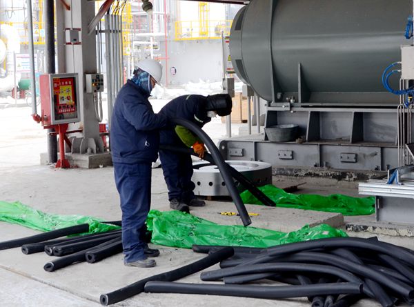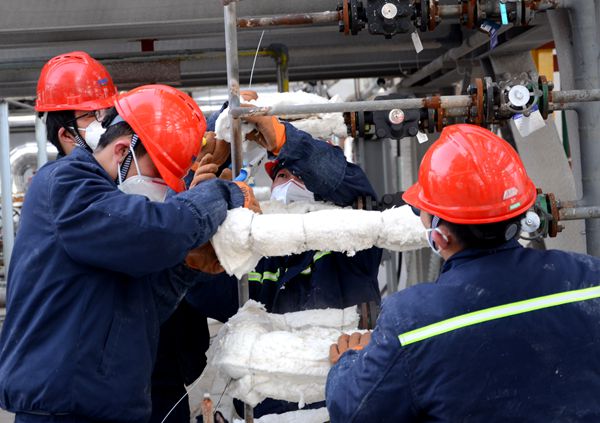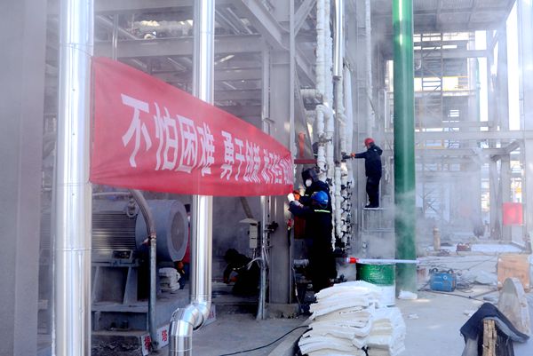 截止11月末,项目施工到了最后冲刺阶段,为赶工期、抢进度,能源公司从各职能部室、后勤部门抽调党员、干部、职工支援建设一线,大家战严寒、斗风雪,发扬“不怕困难、勇于创新、敢于担当、每战必胜”的企业精神,集中利用10天时间给80公里长的各类管线、仪表阀门做保温施工,给装置管线穿上厚厚的“棉衣”过冬。基建施工人员各尽其职,轮班倒,昼夜不停,坚守在各个施工岗位,做好基建收尾工作。开机准备人员紧锣密鼓、加班加点紧张调试,为顺利开机奠定了基础。