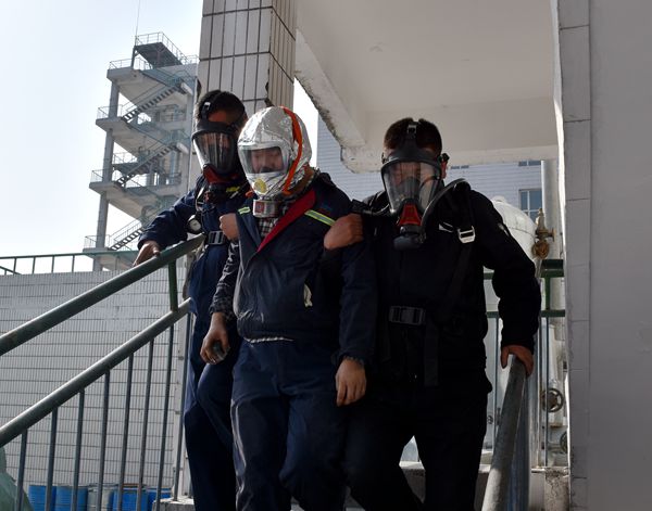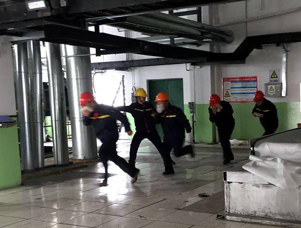 演练现场,拟定于生产二车间三楼助剂房,堆放的杂物发生火灾,控制室主机发出火灾报警警示信号,控制室人员迅速通知巡检人员查看情况,在判断火势有继续蔓延的趋势以后,巡检员立即用对讲机汇报情况。