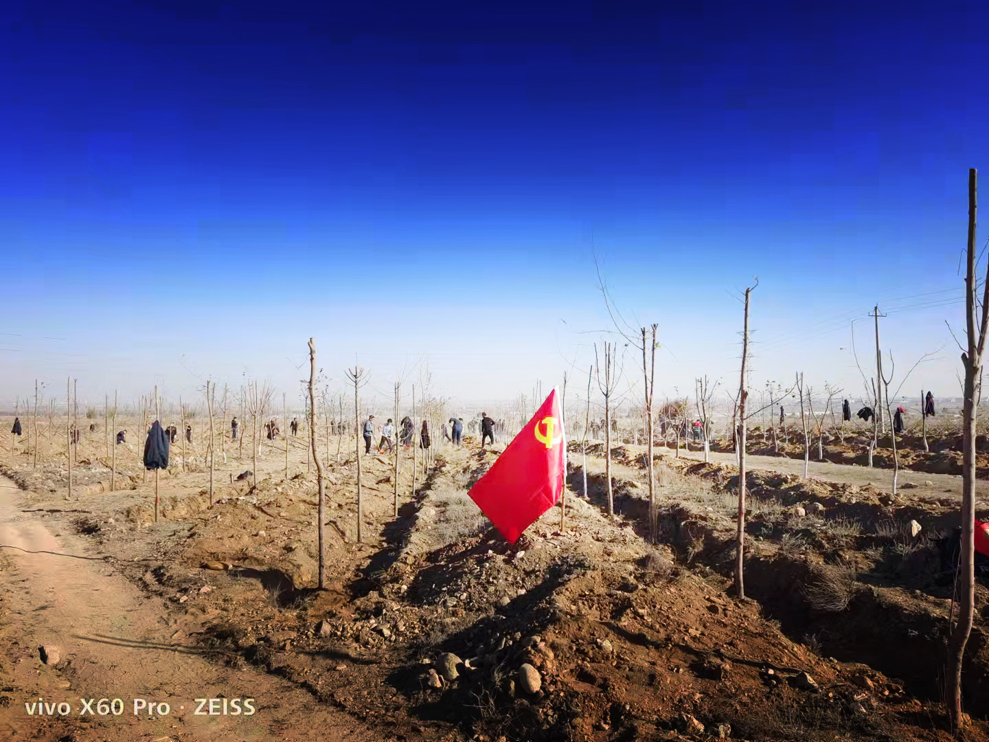 植树现场,广大党员、干部职工精神饱满、热情高涨,大家三两人成一组,明确分工,挥锹铲土,扶树栽苗,密切配合,不怕脏不怕累,个个热情高涨、干劲十足,放眼望去到处是一片热火朝天的劳动景象。一个个忙碌的身影与心中的绿意交相辉映,当真是“党旗红”厚植“生态绿”,红绿融合,绘就出一幅“山青、天蓝、旗红”的“多彩画卷”。
