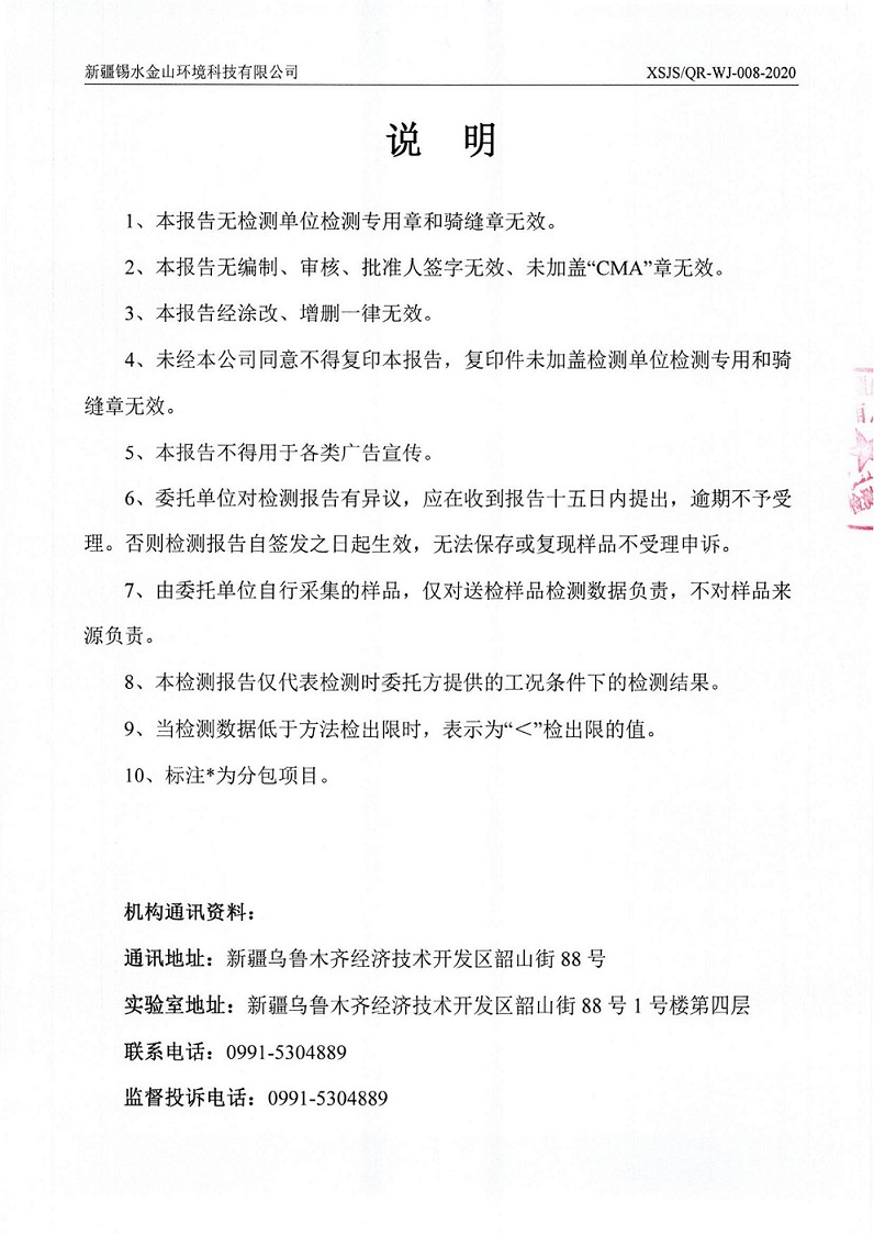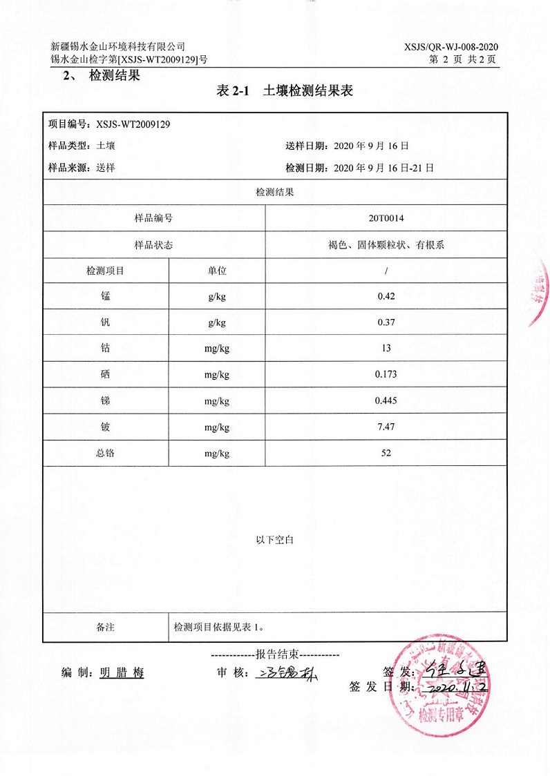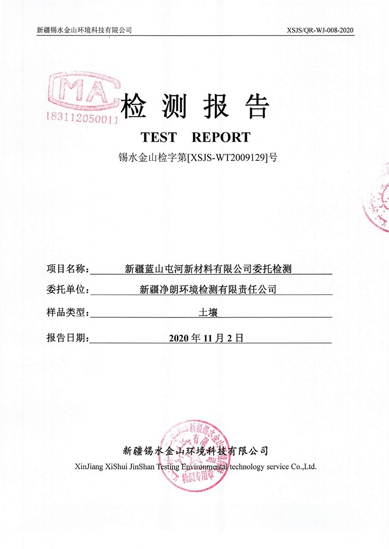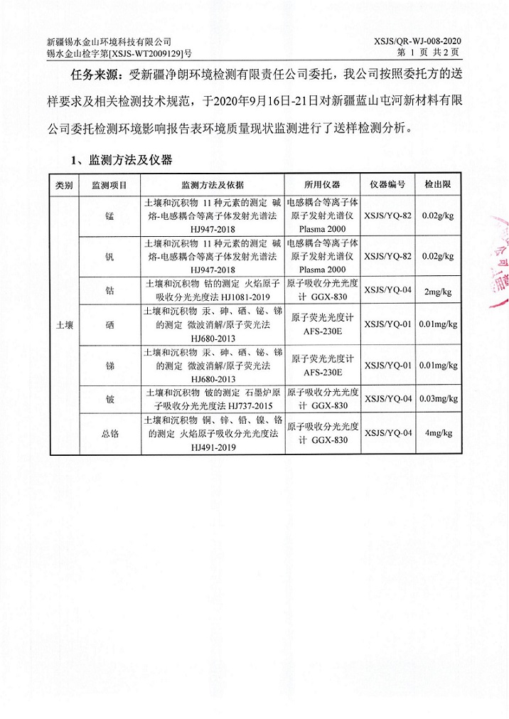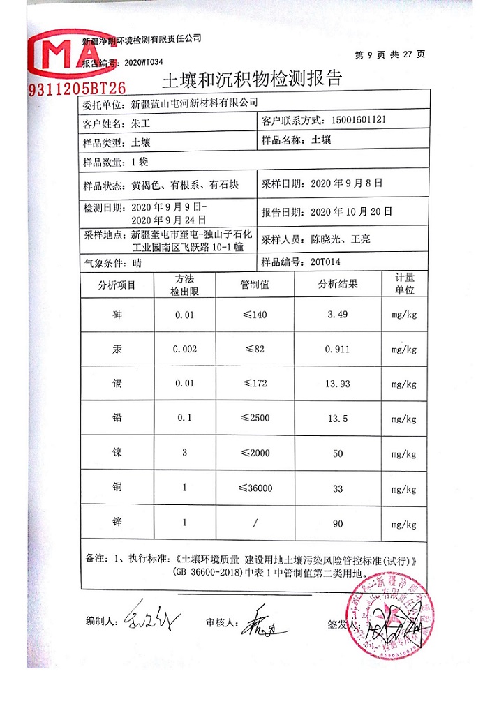2020年9月8日,新疆净朗环境检测有限责任公司、新疆锡水金山环境科技有限公司在新材料公司内抽取土壤样本,进行检测,根据奎屯-独山子经济技术开发区环保局要求,现将新疆Bwin必赢网址新材料有限公司2020年重点污染单位土壤检测情况公示如下: